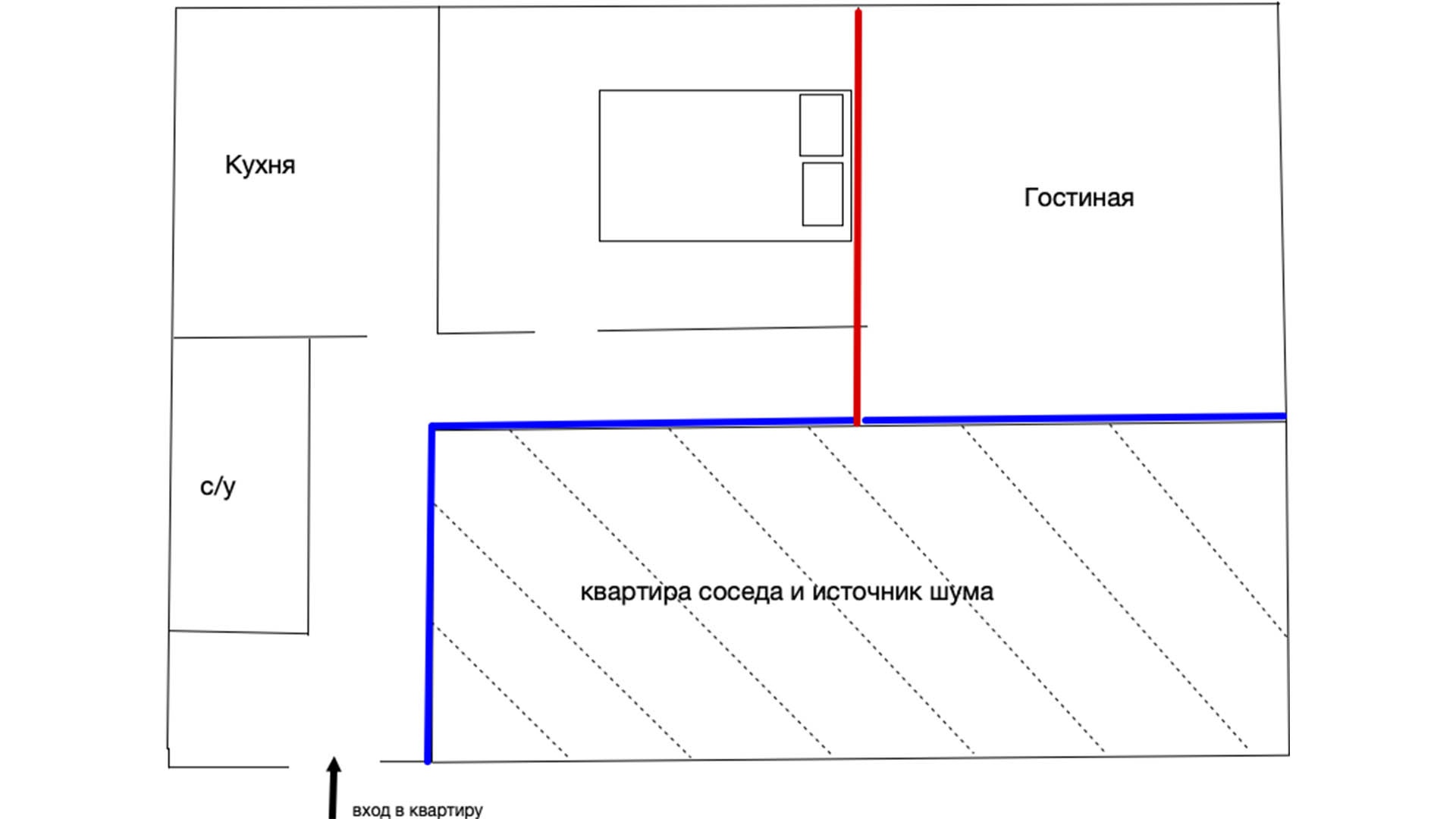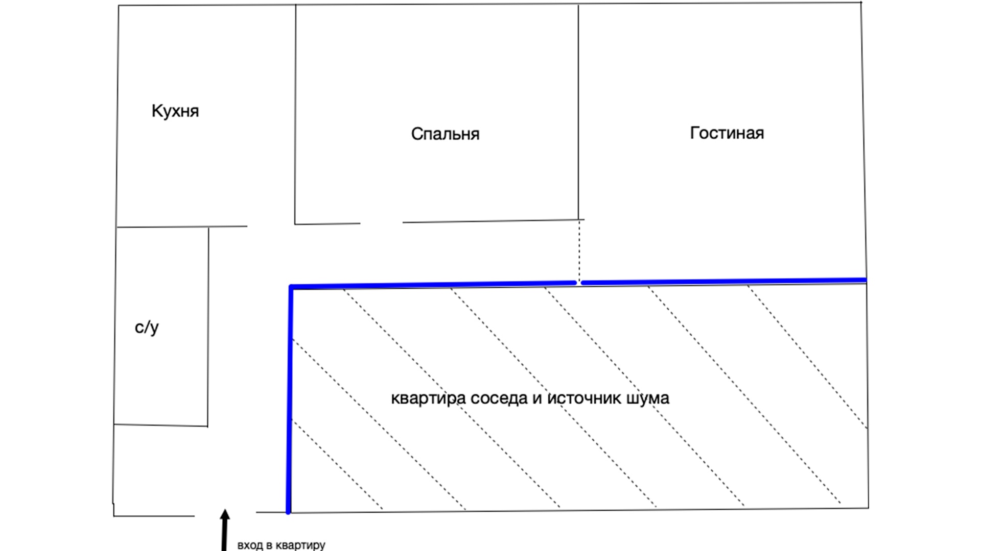 Исходя из полученных данных, мы приняли решение, что звукоизоляции стены по всей длине, граничащей между коридором и квартирой соседа, будет достаточно (Рисунок 1). На Рисунке 1 синей линией обозначены границы монтажа звукоизоляционной облицовки.