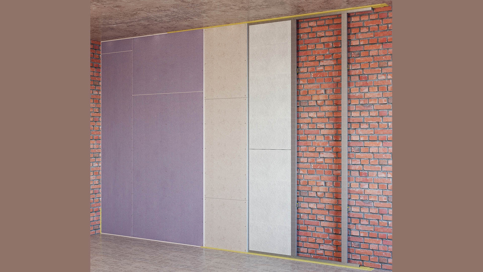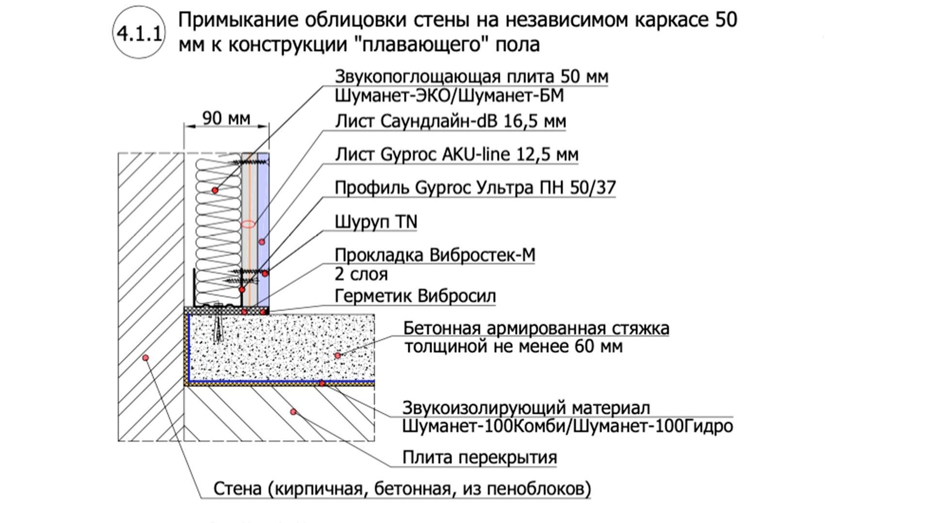 Для звукоизоляции стены мы выбрали классическое решение - независимую звукоизолирующую облицовку на металлическом каркасе 50мм (Рисунок 2-3). Независимый каркас монтируется враспор с полом и потолком, примыкание профиля к поверхностям комнаты осуществляется через виброизоляционную прокладку Вибростек-М. Внутреннее пространство каркаса заполняется акустической ватой Шуманет, далее осуществляется обшивка каркаса звукоизоляционным триплексом Soundline-db и листами Aku-line ГКЛ. Данная облицовка на стене из пеноблока имеет индекс дополнительной звукоизоляции в среднем 15-18 дБ, то есть применив это решение, есть уверенность, что суммарная звукоизоляция стены между квартирами станет не менее 52 дБ, а значит снизит шум, проникающий из квартиры за стеной до комфортных значений.