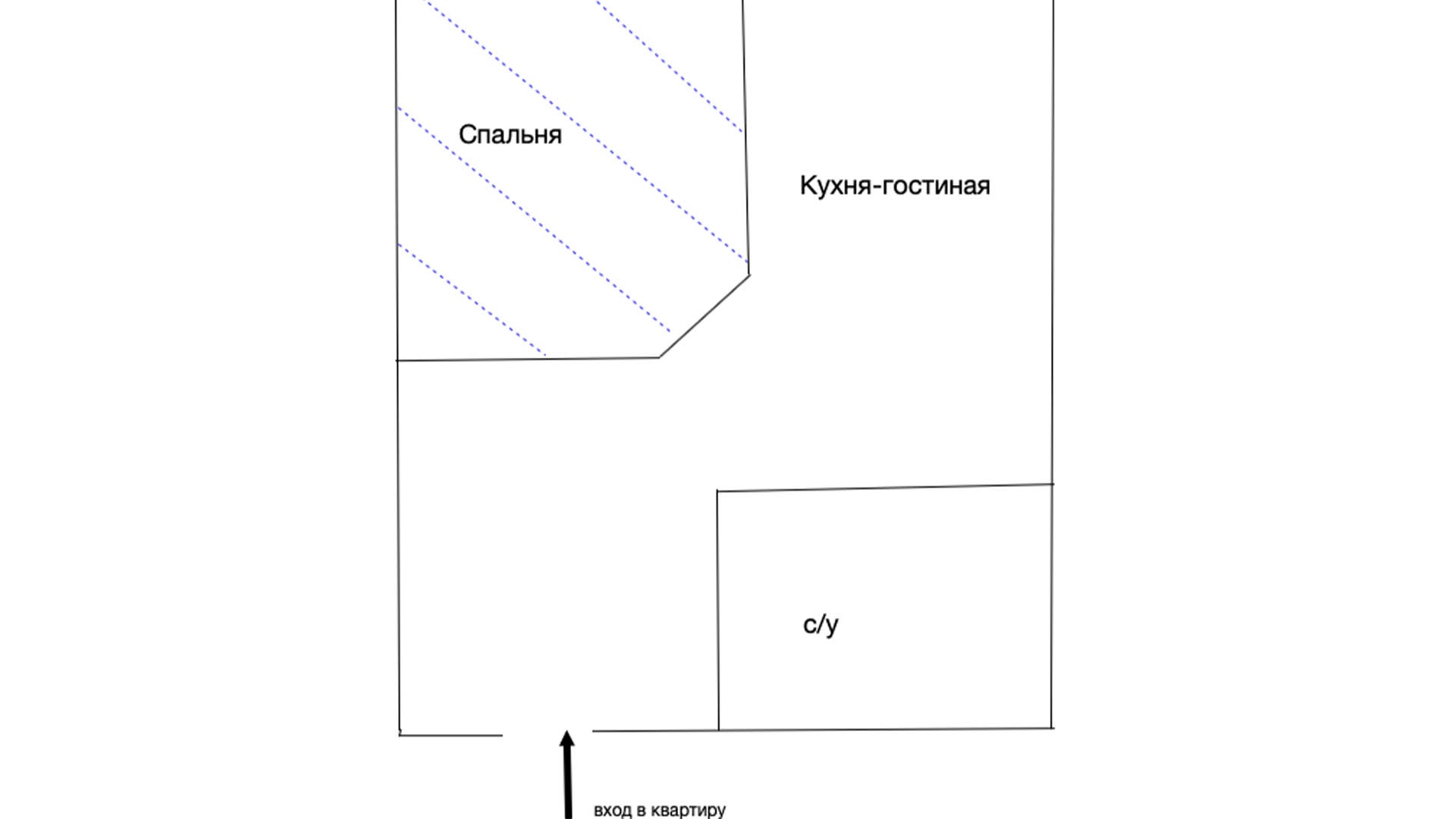 Квартира нашего заказчика была небольшой, состояла из кухни-гостиной и спальни (Рисунок 1), огороженной перегородками из пазогребневых блоков толщиной 80 мм, на что мы сразу обратили внимание, так как «пазогребень» очень звонкий. Такие блоки являются отличным проводником структурного шума и вибраций и являются плохим решением для звукоизоляции. В нашей ситуации комната в квартире снизу была похожа на эхо-камеру, в которой проникающие сверху вниз звуки были слышны со всех сторон – в первую очередь от перекрытия и далее по всем 4-м стенам из «пазогребня».