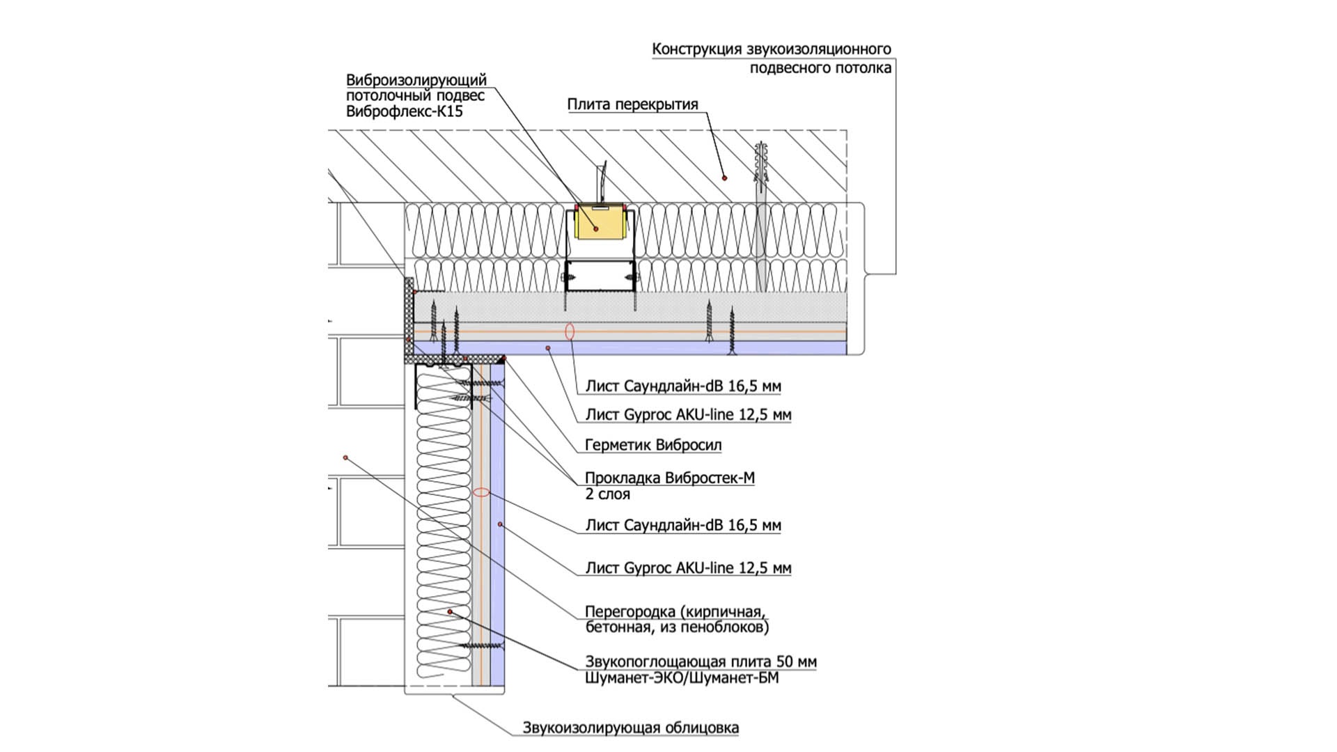 В качестве решения для звукоизоляции потолка была выбрана каркасная конструкция с применением виброизоляционных подвесов Виброфлекс-К15, заполнением звукопоглощающего материала Шуманет-ЭКО в 2 слоя и обшивкой потолка листами ГВЛ 12,5мм и ГКЛ 12,5мм (Рисунок 2). По собственной инициативе клиент в качестве дополнительной меры приклеил мембрану Tecsound прямо на плиту перекрытия, хотя мы уверяли, что решение является бесполезным, так как по технологии производителя данная мембрана применяется между листами ГКЛ, утяжеляя массу их слоев. В схеме клиента мембрана работала в качестве демпфера, при этом ее толщина и масса недостаточны, чтобы демпфировать тяжелую бетонную плиту. Но наша задача – это предупредить клиента о всех нюансах, финальное же решение остается за ним.