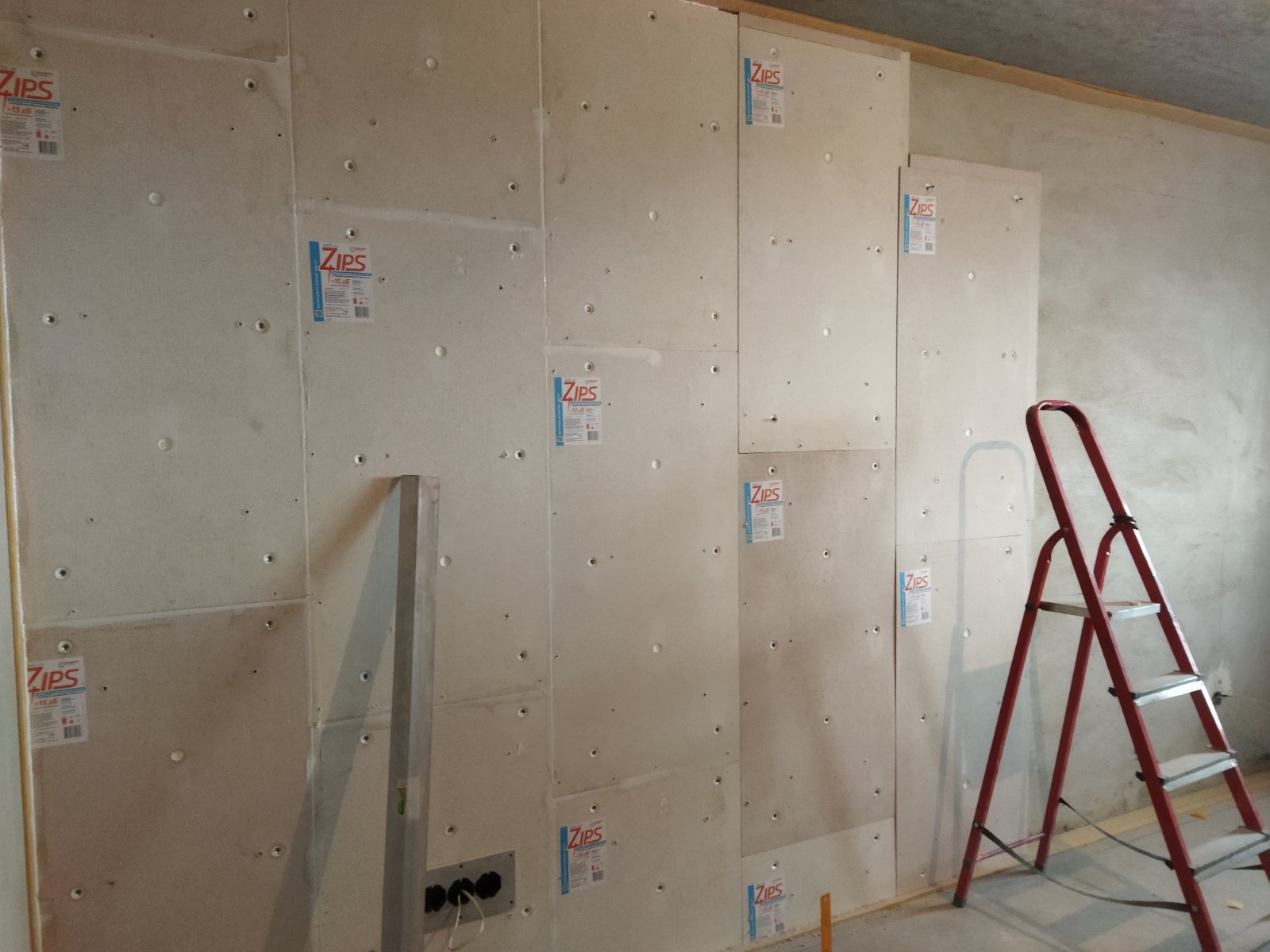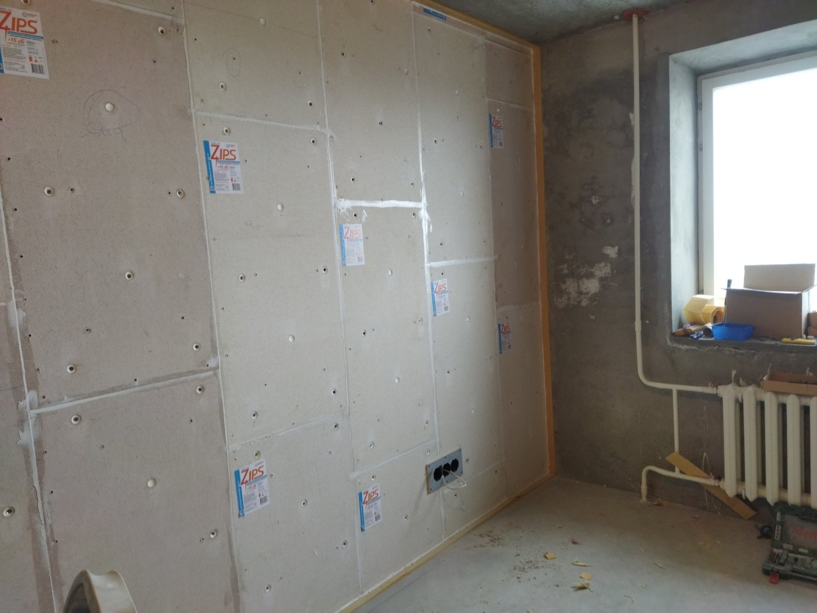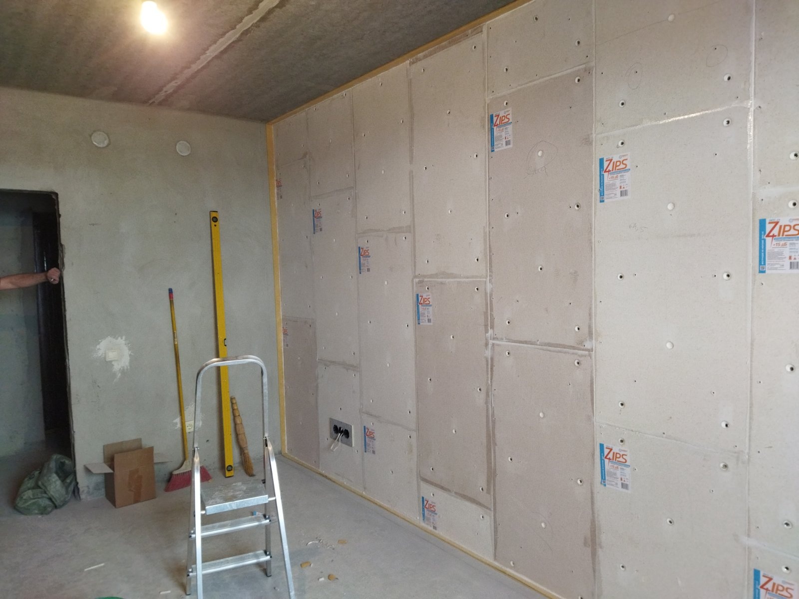 Перепады по всей площади стены 2-3 см. Для звукоизоляции стены мы выбрали идеальный вариант по стоимости и качеству: бескаркасную звукоизоляционную облицовку толщиной 55 мм «ЗИПС-Z4». Данная система c функцией выравнивания поверхности применяется при строительстве и реконструкции зданий любого типа для увеличения звукоизоляции однослойных строительных конструкций: гипсовых, кирпичных и бетонных стен, перегородок, а также железобетонных перекрытий. Предельная неровность поверхности, доступная для выравнивания системой ЗИПС-Z4 составляет 50 мм.