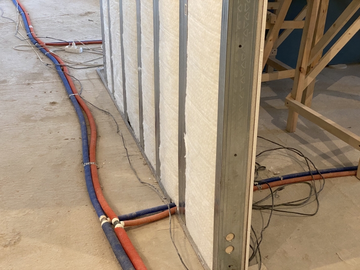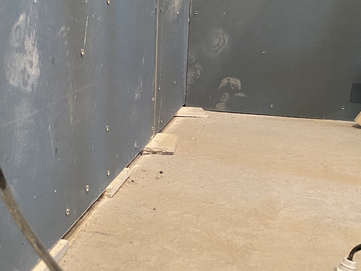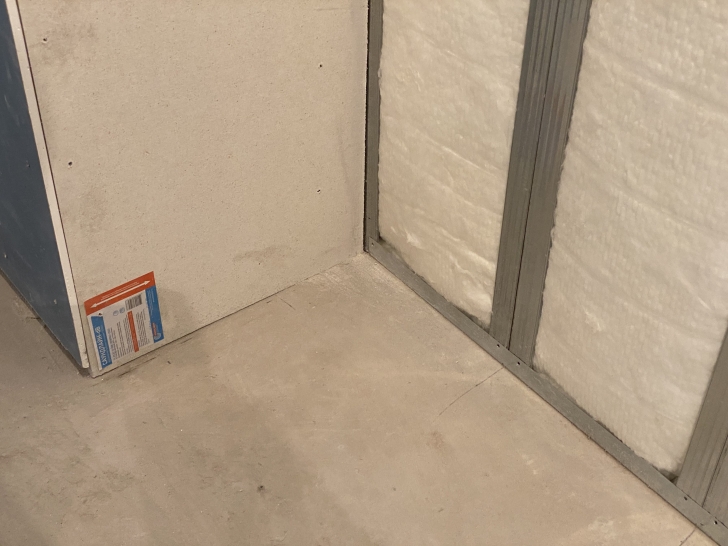 Рис 4. Видно, что отсуствует лента Вибростек-М в местах примыкания ГКЛ Аку-лайн и внутреннего слоя Soundline-dB с перекрытием. Из-за жестких связей звукоизоляция сильно снижена.