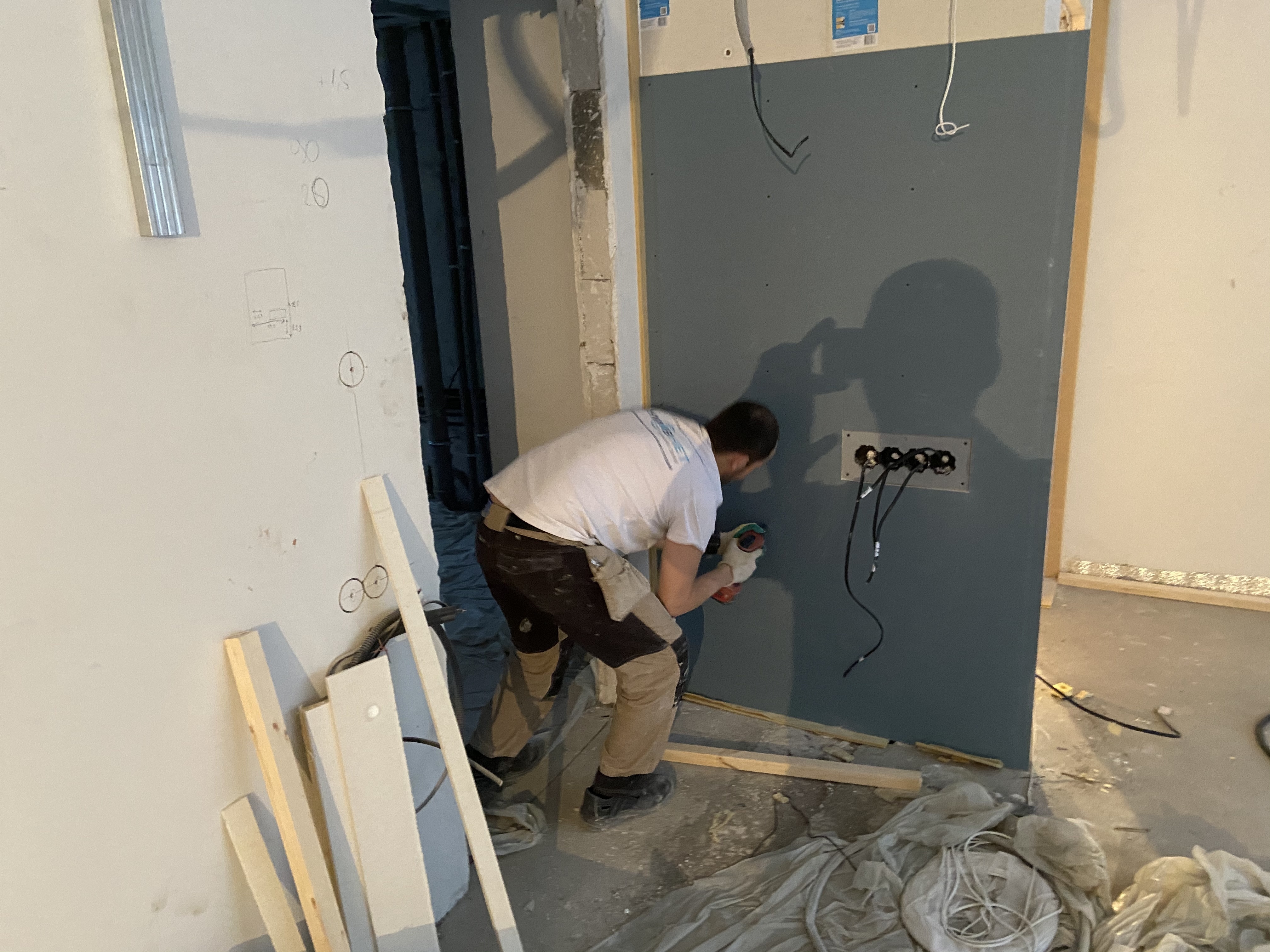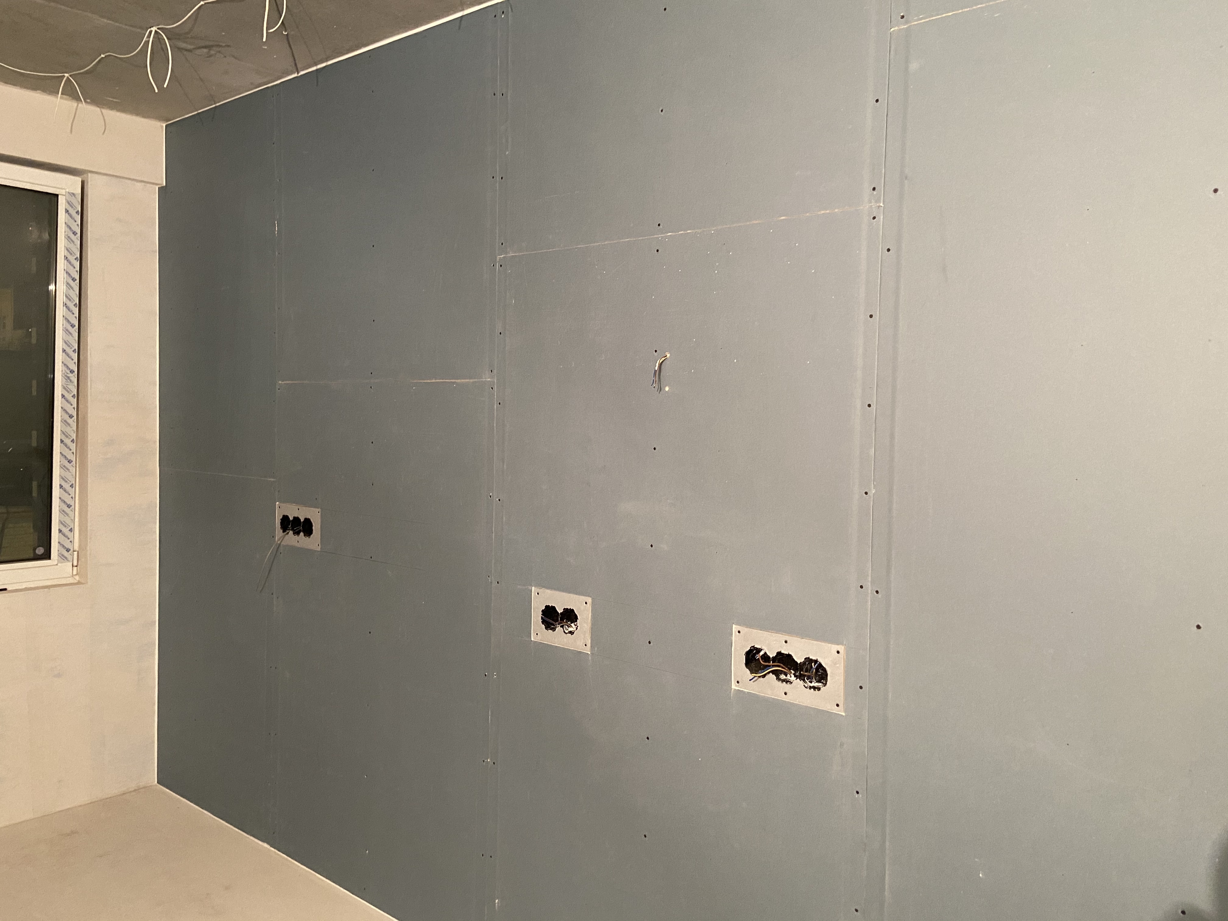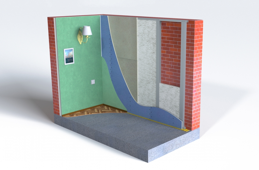 В максимальной комплектации конструкция звукоизоляционной каркасной облицовки состоит из слоя звукопоглощающих плит Шуманет-ЭКО, акустического триплекса Саундлайн-dB, финишных листов Gyproc Aku-line, виброизоляционной ленты Вибростек-М 100, герметика Вибросил, металлических профилей Gyproc-Стандарт ПС 50/50 и ПН 50/40.