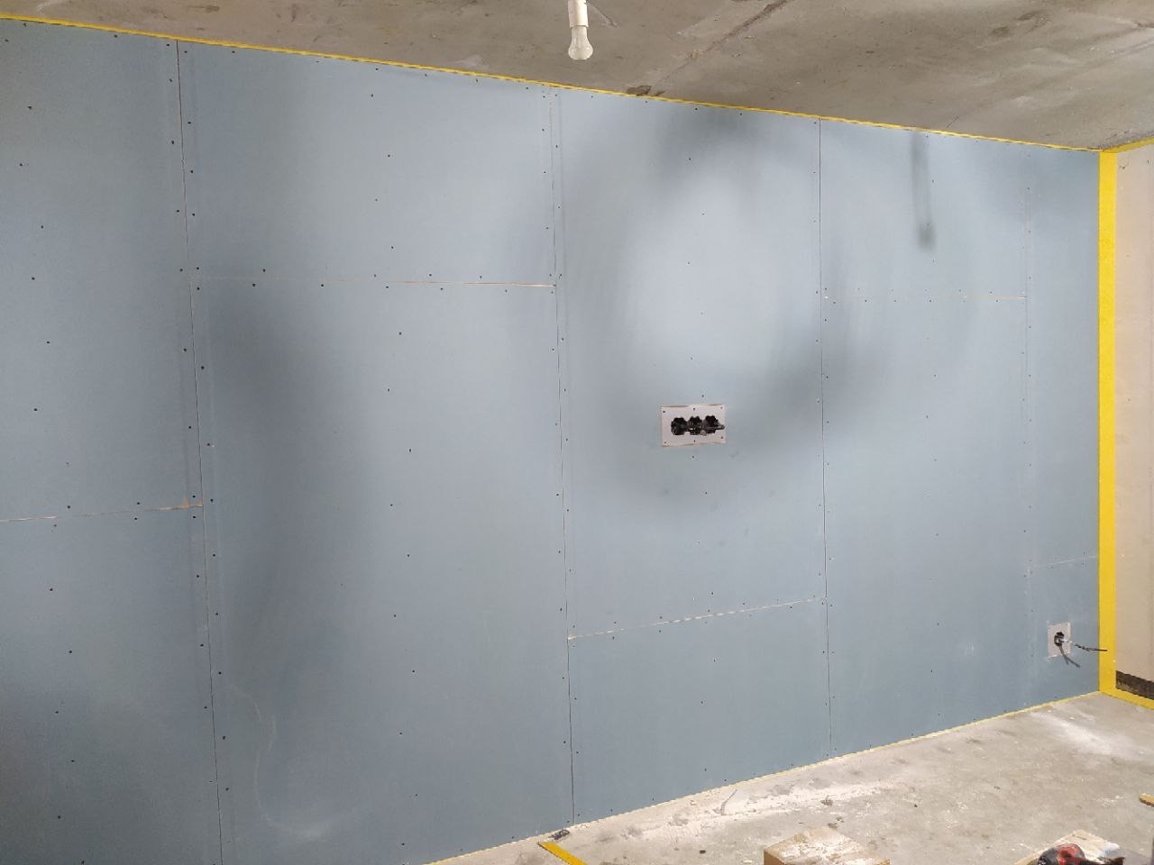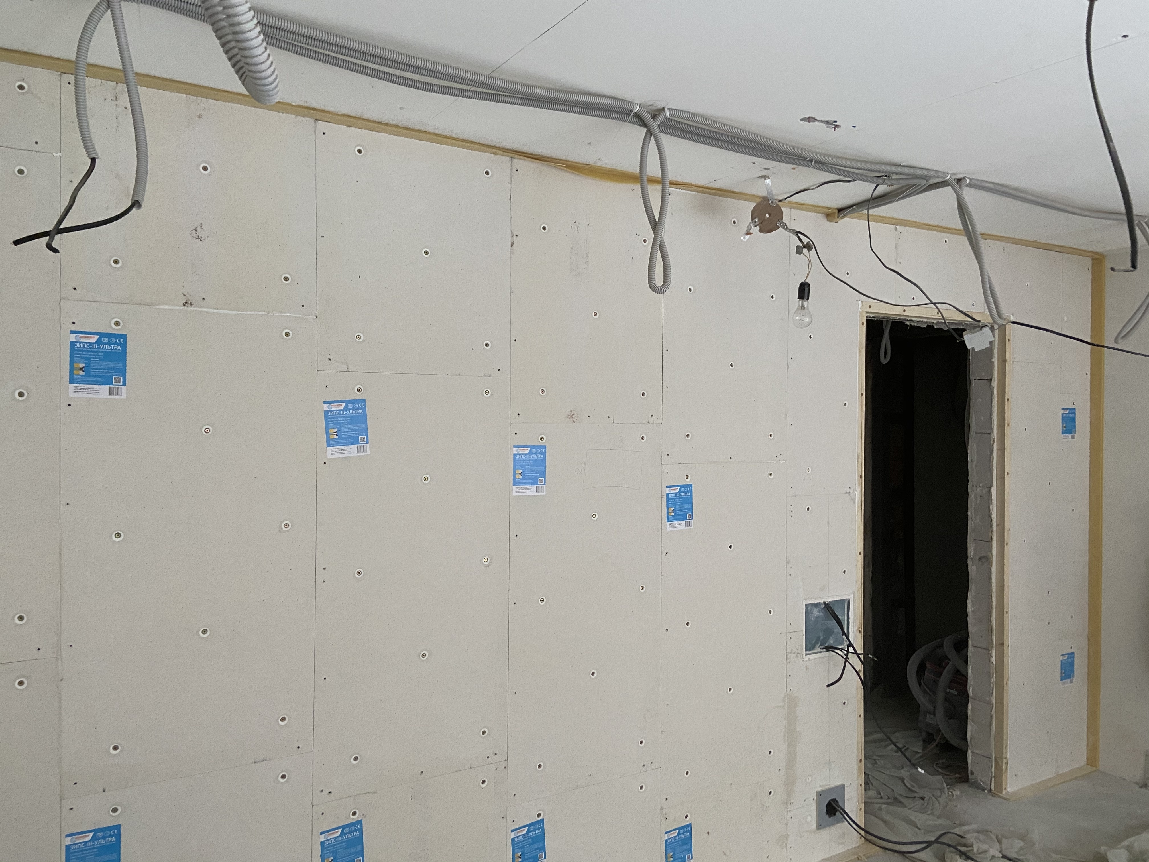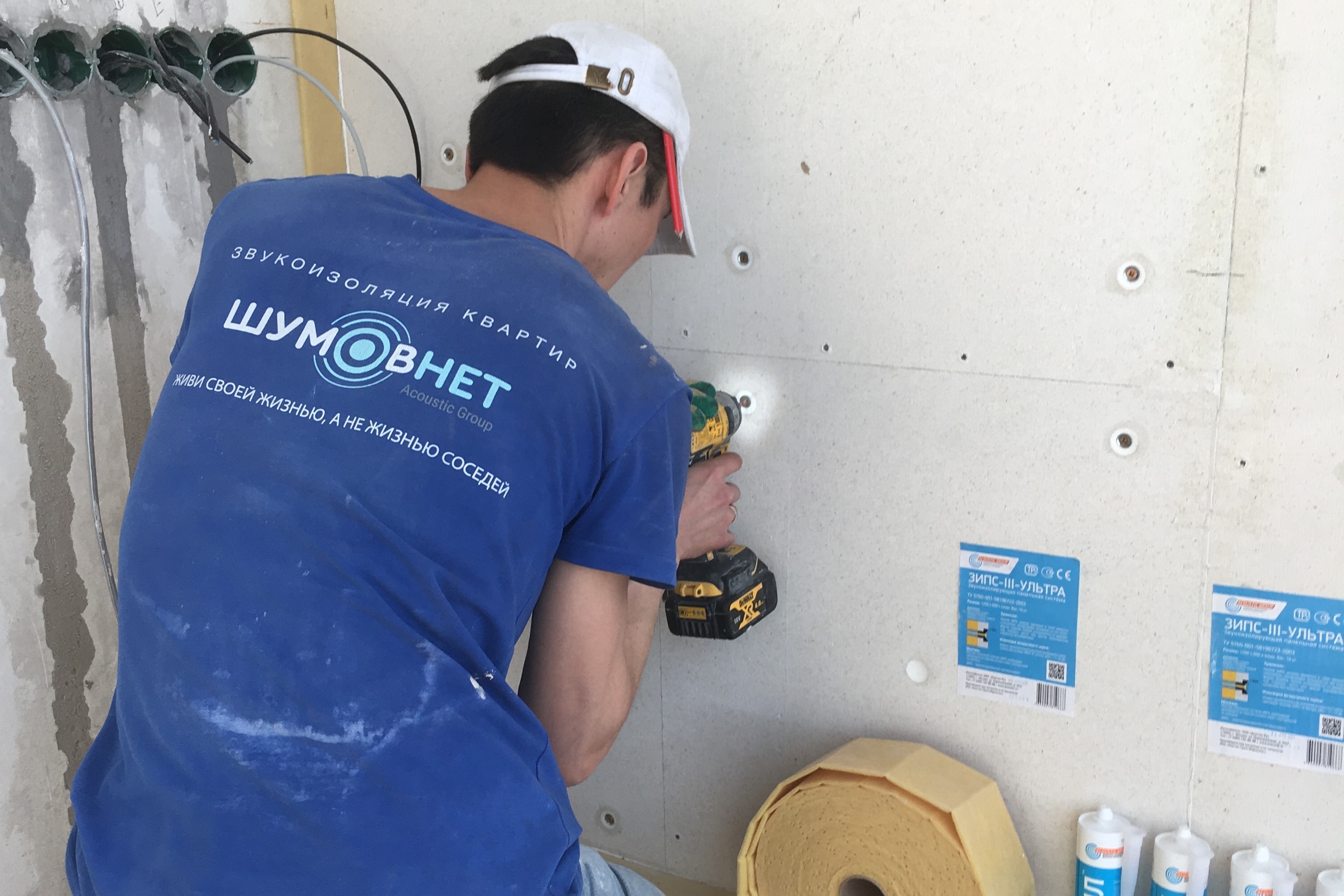 Конструкция звукоизоляционной бескаркасной облицовки состоит из панелей ЗИПС-Вектор толщиной 40 мм, комплекта крепежа, виброизоляционной ленты Вибростек-М 100, финишных листов Gyproc Aku-line и герметика Вибросил. Панели ЗИПС-Вектор крепятся к стене только через существующие виброузлы с помощью пластиковых дюбелей. Головка винта должна вкручиваться в виброузел не глубже, чем 1-2 мм от уровня лицевой стороны панели. Если панель устанавливается целиком (без подрезки) на изолируемую стену, то монтаж осуществляется только с помощью шести узлов крепления, центральные узлы крепления не используются. Если же панель подрезается, то для монтажа используются все доступные узлы крепления. Подрезки менее 250 мм в монтаже не применяются.