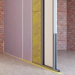 В максимальной комплектации конструкция звукоизоляционной каркасной перегородки состоит из слоя звукопоглощающих плит марки "Шуманет", листов Gyproc Aku-line в 2 слоя, виброизоляционной ленты Вибростек-М 150, герметика Вибросил, металлических профилей ПН 50/40 и ПС 50/50.