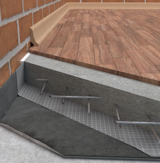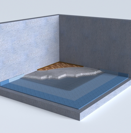 Когда применять: Если нужно снизить шум от шагов, при этом требуется еще и надежная гидроизоляция. Чаще всего применяется во влажных помещениях.