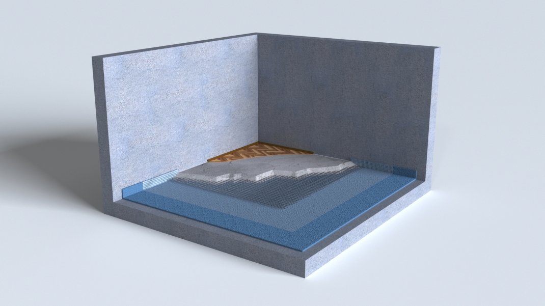 Звукоизоляция пола под стяжку. Звукоизолирующая конструкция соеднего уровня. Используется для защиты от ударного и воздушного шума.