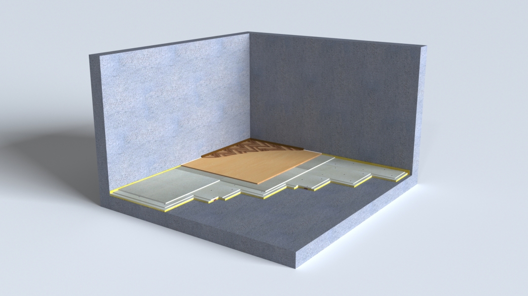 Сборная звукоизоляция пола. Звукоизолирующая конструкция высокого уровня. Используется для защиты от воздушного и ударного шума.
