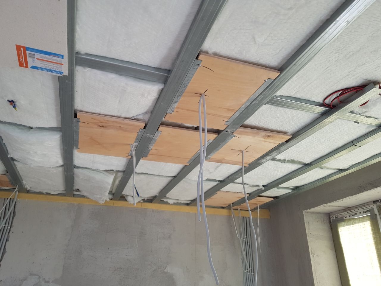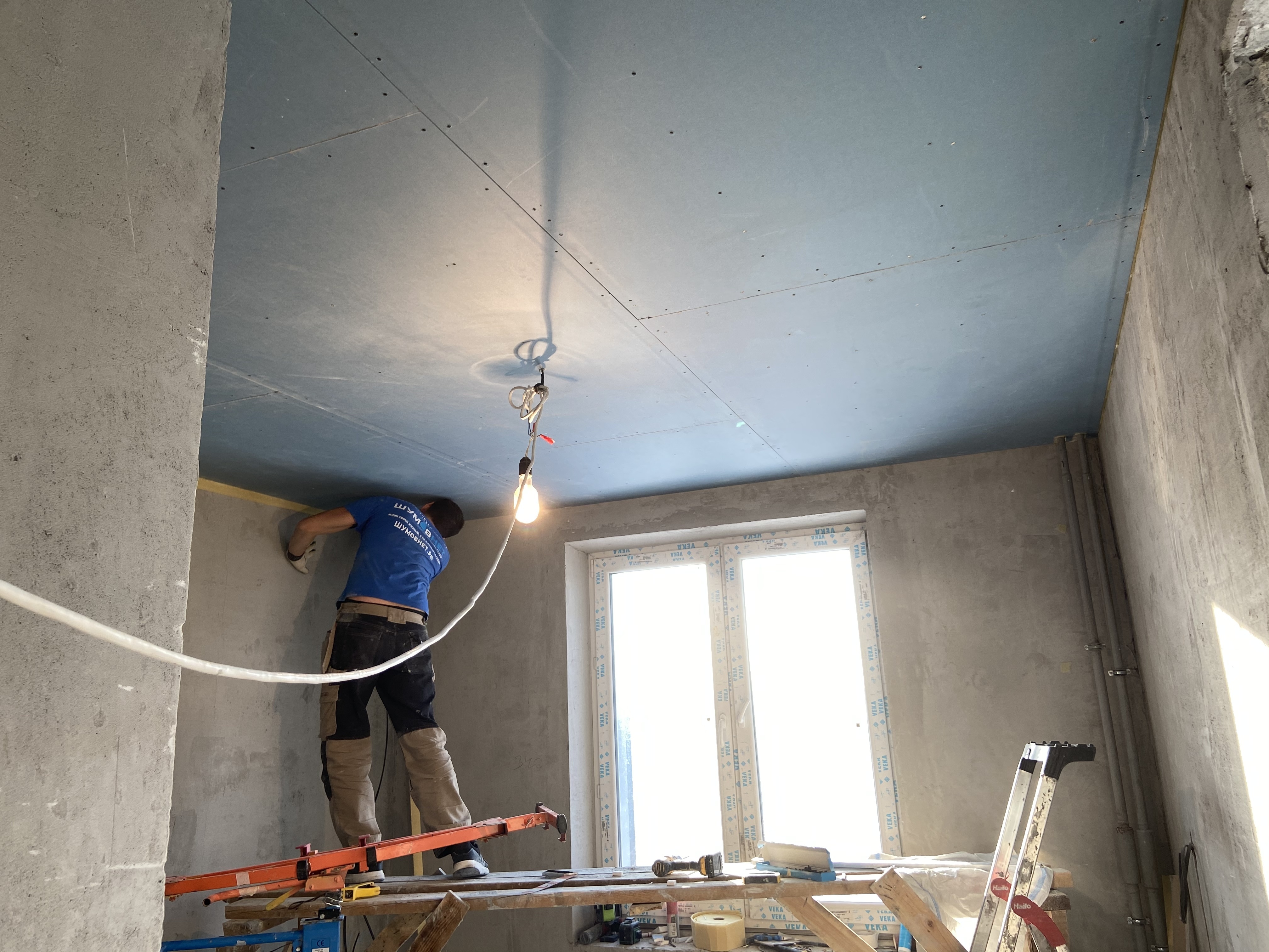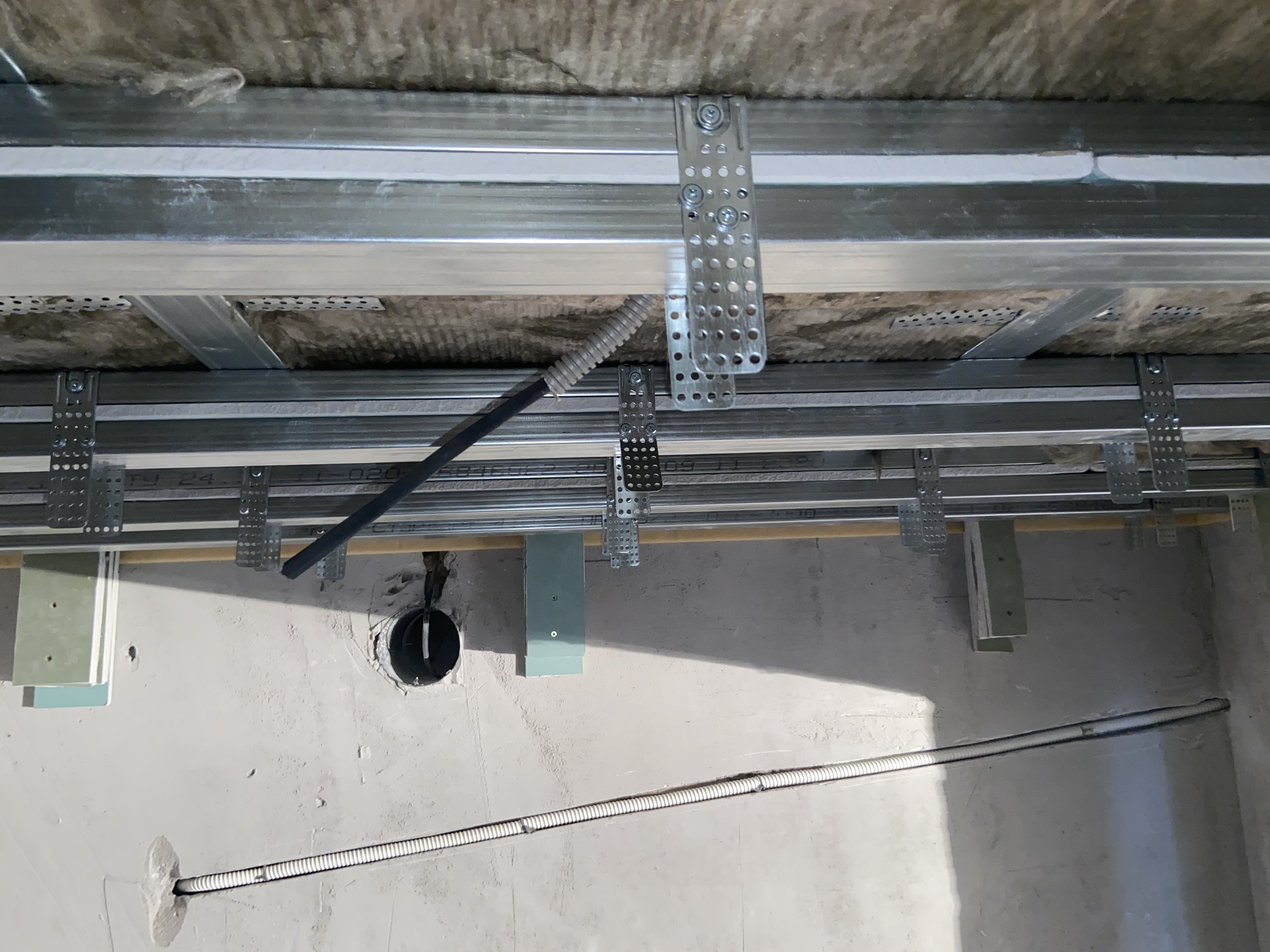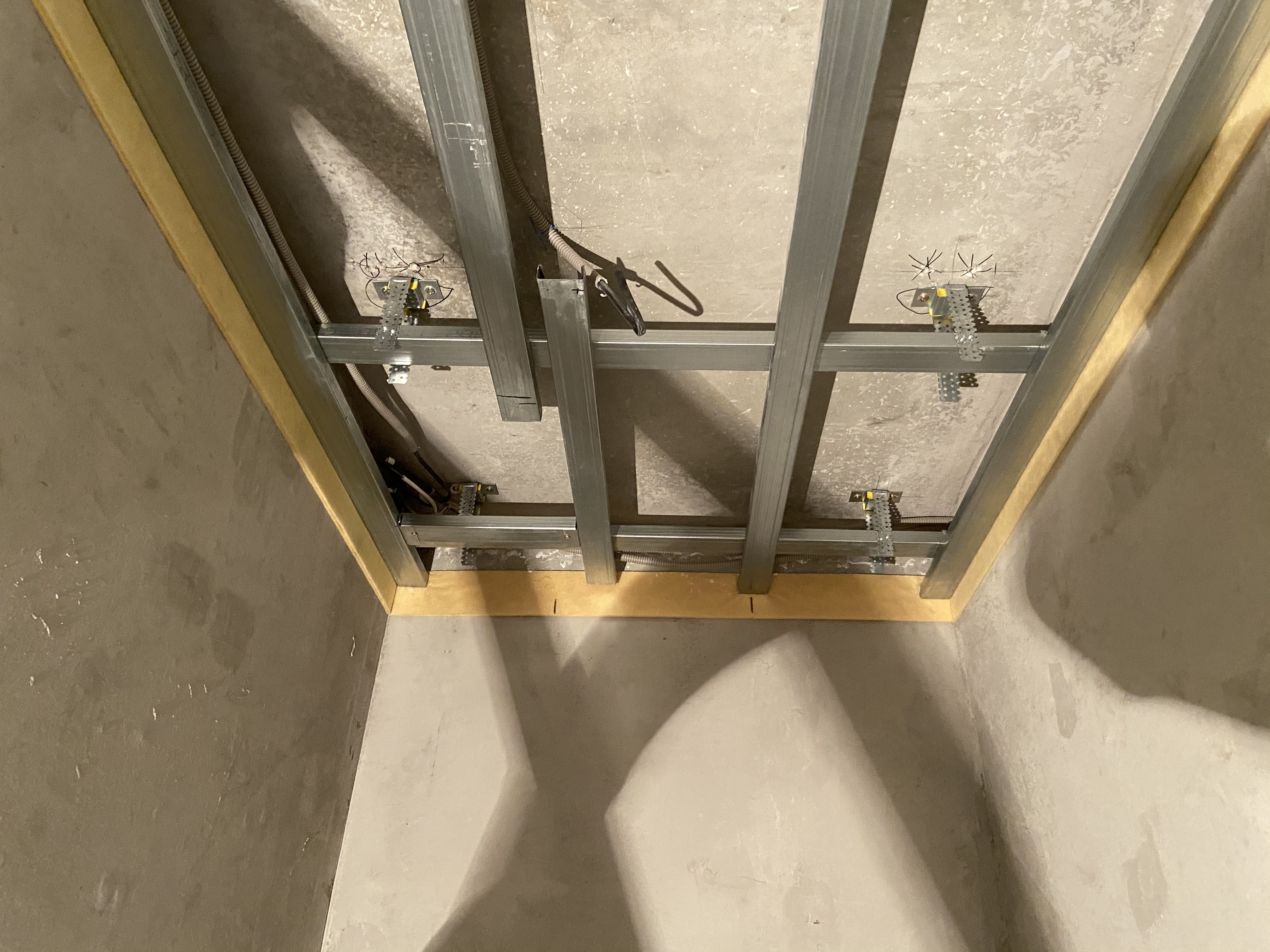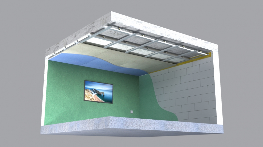 В максимальной комплектации конструкция состоит из металлического двухуровневого каркаса, виброизолирующих подвесов Виброфлекс-Коннект ПП, звукопоглощающей плиты Шуманет-Эко, акустического триплекса Саундлайн-dB и обшивных листов Gyproc AKU-line. Каркас закрепляется к перекрытию с помощью виброизолирующих подвесов Виброфлекс-Коннект ПП.